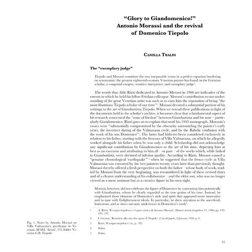 The essays introduce in detail to the materials of Morassi’s Archive and Photo Archive and his library fund. The series of the Divertimento with Pulcinella as main character, recurrent in Giambattista and Giandomenico’s works, is analysed through its critical discussion, in light of its dispersal starting from the 20s and 30s. Moreover, Antonio Morassi’s role is defined in the broad survey of studies about the Tiepolos, the ancient drawings and their collecting, and thanks to his intellectual legacy preserved at Ca’ Foscari University it is now possible to rediscover precious documents such as the two albums, whose restoration is accurately descripted.
